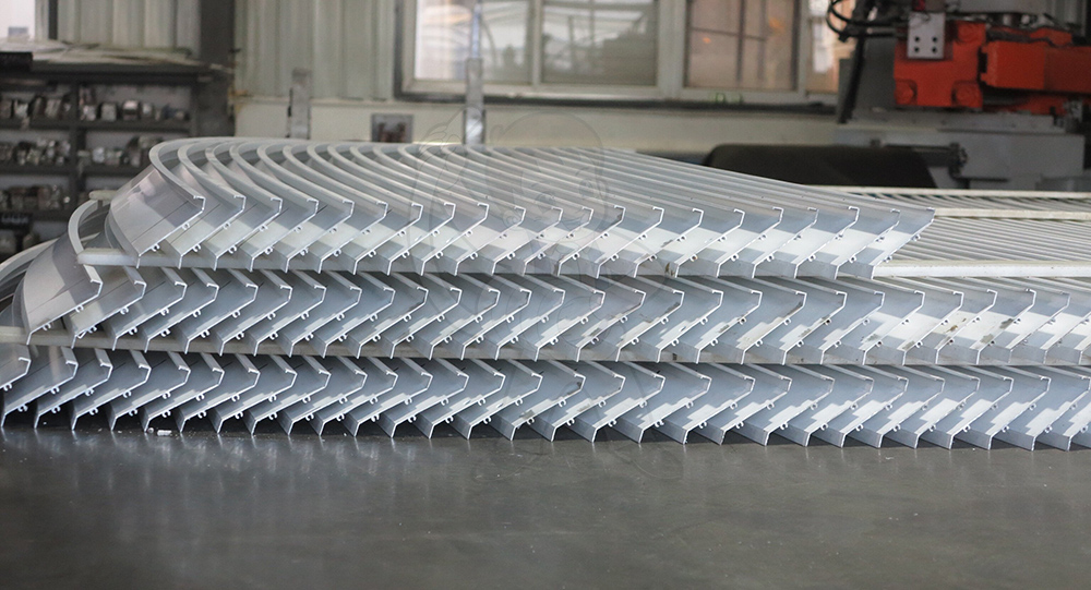 盛達(dá)拉彎技術(shù)人員經(jīng)過(guò)刻苦鉆研,設(shè)計(jì)出來(lái)獨(dú)特的工裝夾具和成型模具,使得拉彎過(guò)程中型材截面變形相當(dāng)微小,型材彎曲一致性非常好,整齊美觀,格柵縫隙均勻,提升了遮陽(yáng)百葉的功能與觀感。